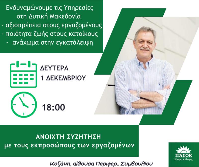 Ανοιχτή συζήτηση με τους αιρετούς εκπροσώπους των εργαζομένων στις Υπηρεσίες της Δημόσιας Διοίκησης και της Τοπικής Αυτοδιοίκησης που εδρεύουν στο νομό Κοζάνης και ευρύτερα στη Δυτική Μακεδονία, διοργανώνει ο Πάρις Κουκουλόπουλος τη Δευτέρα 1η Δεκεμβρίου και ώρα 18:00 στην Κοζάνη, στην αίθουσα συνεδριάσεων του κτιρίου της Περιφερειακής Ενότητας Κοζάνης (πρώην Νομαρχιακού Συμβουλίου Κοζάνης, Δημοκρατίας 27).