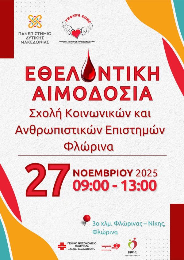 Την Πέμπτη 27 Νοεμβρίου 2025, από τις 09:00 έως 13:00, πραγματοποιείται εθελοντική αιμοδοσία στο Εργαστήριο Φυσικών Επιστημών της Σχολής Κοινωνικών και Ανθρωπιστικών Επιστημών του Πανεπιστημίου Δυτικής Μακεδονίας στη Φλώρινα.