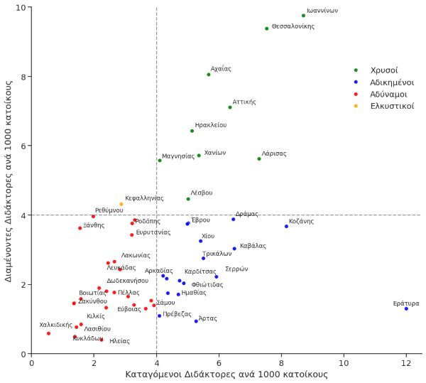 Φαίνεται ότι, υπό ορισμένες κοινωνικοοικονομικές συνθήκες, η φτώχια οδηγεί στην μόρφωση υψηλού επιπέδου. Δεν ισχύει όμως παντού. Για παράδειγμα, οι Περιφέρειες Πελοποννήσου και Στερεάς Ελλάδας υστερούν και στην “γεννηση” διδακτόρων και σε κατά κεφαλήν διαθέσιμο εισόδημα.