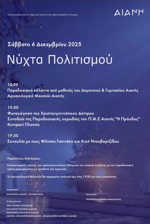 Το Σάββατο 6 Δεκεμβρίου 2025, η Αιανή υποδέχεται τα Χριστούγεννα με μια ξεχωριστή «Νύχτα Πολιτισμού». Οι εκδηλώσεις θα ανοίξουν στο Αρχαιολογικό Μουσείο Αιανής, όπου μαθητές του Δημοτικού και του Γυμνασίου θα παρουσιάσουν παραδοσιακά κάλαντα, δίνοντας το έναυσμα για το εορταστικό κλίμα.