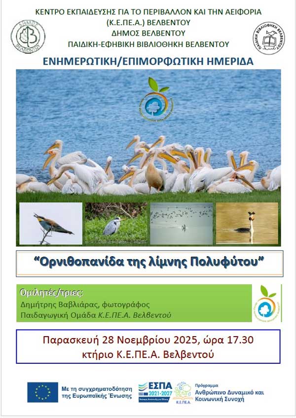 Το Κέντρο Εκπαίδευσης για το Περιβάλλον και την Αειφορία (Κ.Ε.ΠΕ.Α.) Βελβεντού, σε συνεργασία με τον Δήμο Βελβεντού και την Παιδική & Εφηβική Βιβλιοθήκη Βελβεντού, διοργανώνει Επιμορφωτική/Ενημερωτική Ημερίδα, την Παρασκευή 28 Νοεμβρίου 2025 και ώρα 17.30, με τίτλο «Ορνιθοπανίδα της λίμνης Πολυφύτου», στις εγκαταστάσεις του στο Βελβεντό.