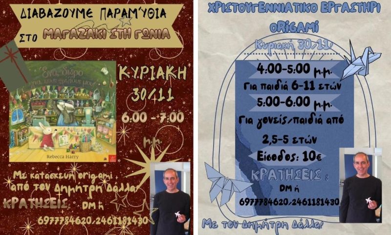 Μετά την αφήγηση, θα ακολουθήσει εργαστήριο origami με τον Δημήτρη Δάλλα, όπου τα παιδιά θα δημιουργήσουν τις δικές τους χειροποίητες κατασκευές εμπνευσμένες από το παραμύθι.