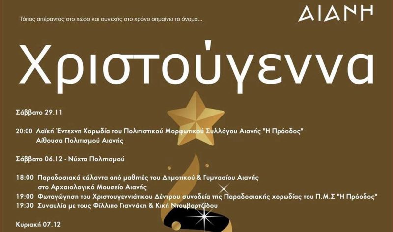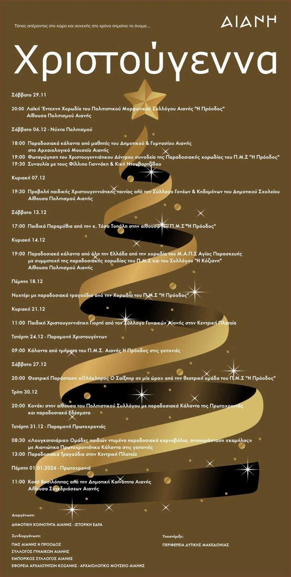 Με ένα ιδιαίτερα πλούσιο και ποικίλο πρόγραμμα μπαίνει στη γιορτινή περίοδο η Αιανή. Από το Σάββατο 29 Νοεμβρίου έως και την 1η Ιανουαρίου, θα φιλοξενήσει συναυλίες, τη φωταγώγηση του χριστουγεννιάτικου δέντρου, εκδηλώσεις για παιδιά, αφηγήσεις παραμυθιών, προβολές χριστουγεννιάτικων ταινιών, παραδοσιακά κάλαντα και τοπικά εδέσματα.