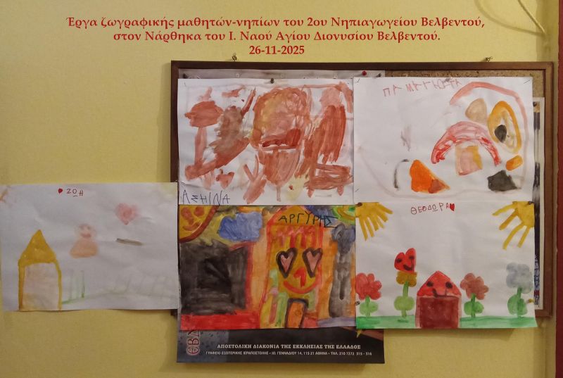 Έχουμε τη μέγιστη χαρά, αγάλλεται η καρδιά μας, μεταφέρεται η αθωότητά τους σε μας, καθώς φιλοξενούμε στον Νάρθηκα του Ι. Ενοριακού Ναού του Αγίου Διονυσίου Βελβεντού απλές ζωγραφιές (έργα ζωγραφικής) των μαθητών του 2ου Νηπιαγωγείου Βελβεντού. Μας τις έδωσαν οι μαθητές με χαρά.