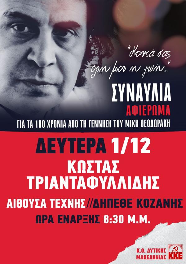 ΚΟ Δυτικής Μακεδονίας του ΚΚΕ: Μεγάλη συναυλία για τα 100 χρόνια από τη γέννηση του Μίκη Θεοδωράκη με τον Κώστα Τριανταφυλλίδη στην Κοζάνη