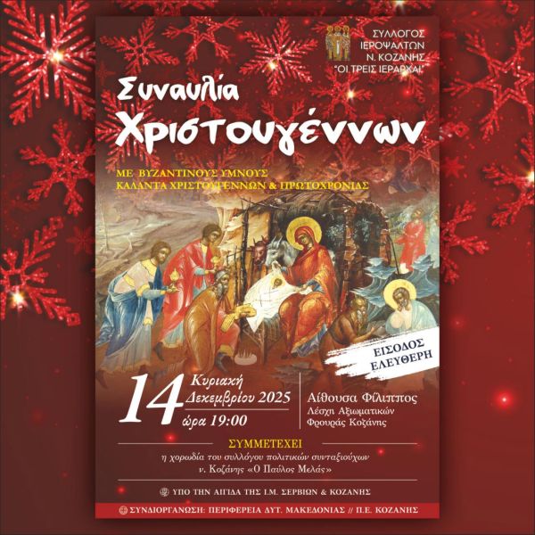 Χριστουγεννιάτικη Συναυλία διοργανώνει ο Σύλλογος Ιεροψαλτών Ν. Κοζάνης «Οι Τρεις Ιεράρχαι», σε συνεργασία με την Περιφέρεια Δυτικής Μακεδονίας – Π.Ε. Κοζάνης και υπό την αιγίδα της Ι.Μ. Σερβίων & Κοζάνης.Η εκδήλωση θα πραγματοποιηθεί την Κυριακή 14 Δεκεμβρίου 2025, στις 19:00, στην Αίθουσα Φίλιππος – Λέσχη Αξιωματικών Φρουράς Κοζάνης, με ελεύθερη είσοδο.