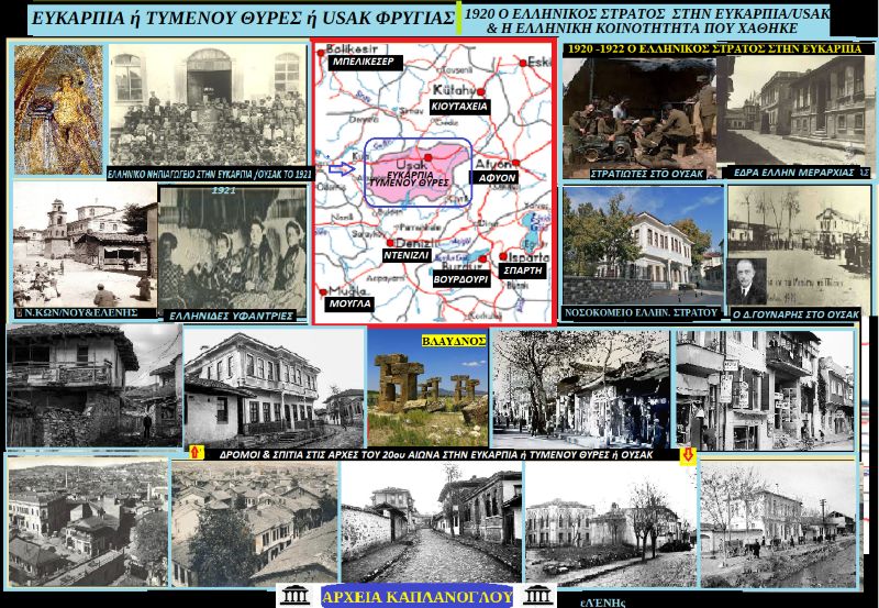 Τα διαχρονικά ονόματα της Ευκαρπίας του σημερινού Usak είναι Τημένου θύραι με διάφορες παραλλαγές , Φλαβιόπολις , Ουσάκ ( Uşak )