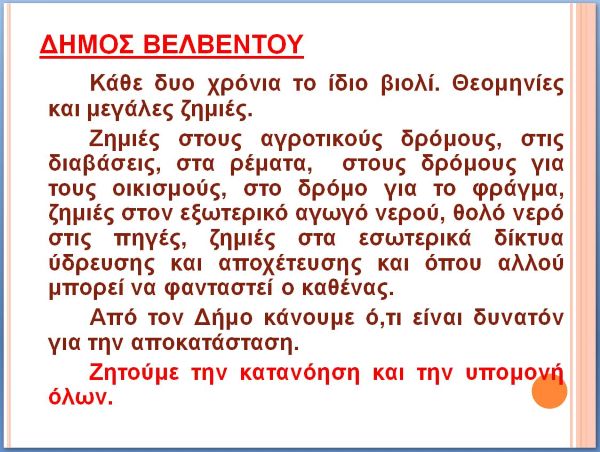 Ο Δήμος Βελβεντού, με επίσημη ανακοίνωση προς τους δημότες του, ενημέρωσε ότι: