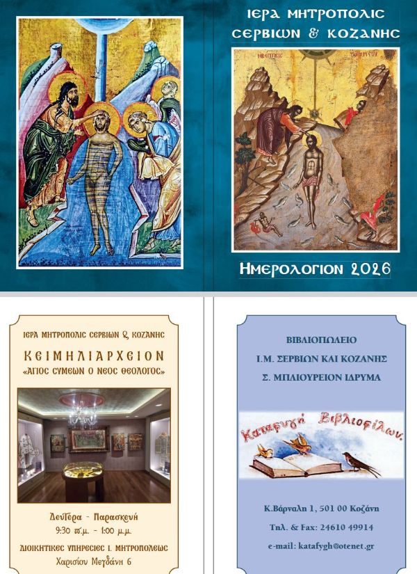Συνεχίζοντας την κατηχητική προσφορά της η Ι. Μητρόπολις Σερβίων και Κοζάνης κυκλοφόρησε και φέτος το ΗΜΕΡΟΛΟΓΙΟΝ τσέπης (2026, έτος ΚΖ΄, σελ. 96, έγχρωμο, εικονογραφημένο), με εικόνες βαπτίσεως του Ιησού Χριστού, που συμπληρώνουν το επίλεκτο και πάντα επίκαιρο θέμα του μυστηρίου του βαπτίσματος.