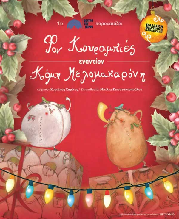 Τη θεατρική διασκευή υπογράφει ο ίδιος ο συγγραφέας Κυριάκος Χαρίτος μεταφέροντας με χιούμορ και φαντασία την πιο γλυκιά αναμέτρηση όλων των εποχών: κουραμπιέδες πασπαλισμένοι με άχνη απέναντι σε μελομακάρονα βουτηγμένα στο μέλι και τα καρύδια.
