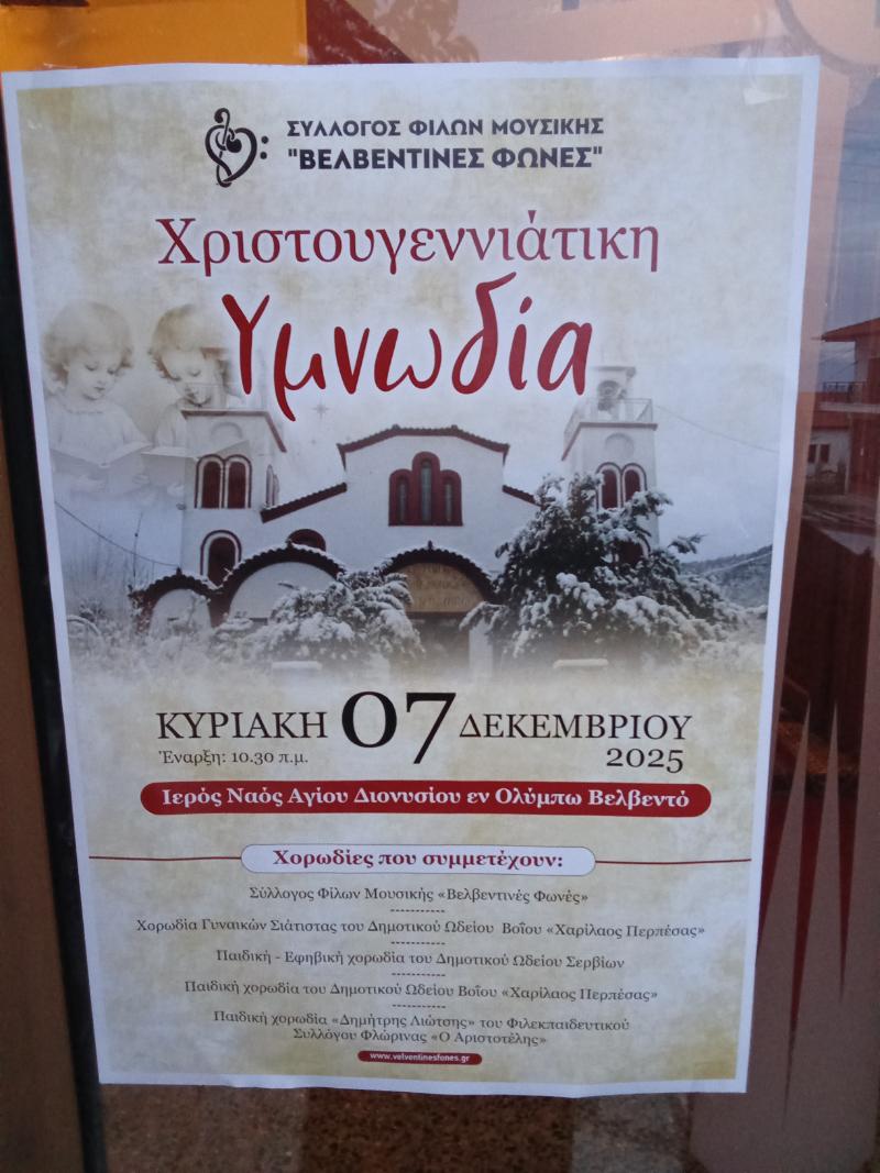 Ο Σύλλογος Φίλων Μουσικής ‘’Βελβεντινές (σημ. δική μου: μελωδικές) Φωνές’’ με σεβασμό και σεμνότητα, και με την προσέλευση πολλών φιλόμουσων από το Βελβεντό, τα Σέρβια, το Πλατανόρρευμα, την Καστανιά, τη Λάβα, την Κοζάνη, πραγματοποίησε εκδήλωση με θέμα: ‘’Χριστουγεννιάτικη Υμνωδία’’ στον Ιερό Ναό του Αγίου Διονυσίου εν Ολύμπω στο Βελβεντό, την Κυριακή, 7-12-2025, μετά τη Θεία Λειτουργία, στην οποία (Θεία Λειτουργία) συμμετείχαν οι ‘’Β. Φωνές’’ και οι προσκεκλημένες και συμμετέχουσες στην εκδήλωση καλλίφωνες Χορωδίες.