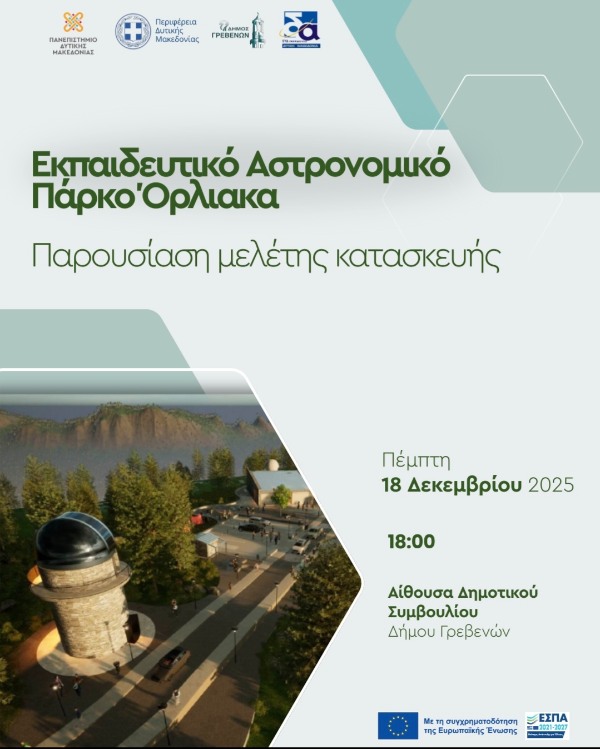 Εκδήλωση παρουσίασης της μελέτης κατασκευής του Εκπαιδευτικού Αστρονομικού Πάρκου Όρλιακα διοργανώνουν το Πανεπιστήμιο Δυτικής Μακεδονίας, η Περιφέρεια Δυτικής Μακεδονίας και ο Δήμος Γρεβενών, την Πέμπτη 18 Δεκεμβρίου 2025, στις 18:00, στην Αίθουσα Δημοτικού Συμβουλίου του Δήμου Γρεβενών.