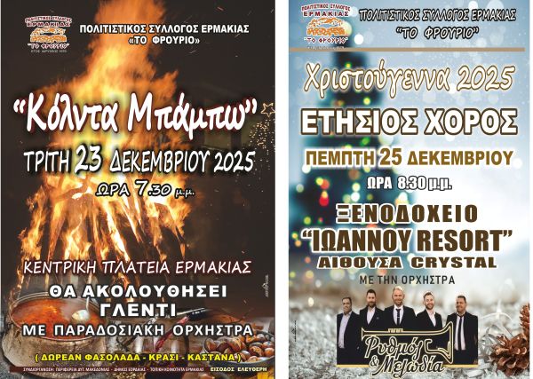 Ο Πολιτιστικός Σύλλογος Ερμακιάς “ΤΟ ΦΡΟΥΡΙΟ” με χαρά σας προσκαλεί στις Χριστουγεννιάτικες εκδηλώσεις του!