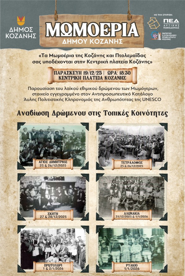 Υπενθυμίζεται ότι την Παρασκευή 19 Δεκεμβρίου 2025 στις 18:30 το απόγευμα, θα πραγματοποιηθεί στην κεντρική πλατεία Νίκης της Κοζάνης, η επίσημη πρώτη παρουσίαση του μεγάλου ποντιακού εθίμου των Μωμόγερων από Κοζάνη και Εορδαία, στο πλαίσιο των Χριστουγεννιάτικων Εκδηλώσεων του Δήμου Κοζάνης, που είναι σε πλήρη εξέλιξη.