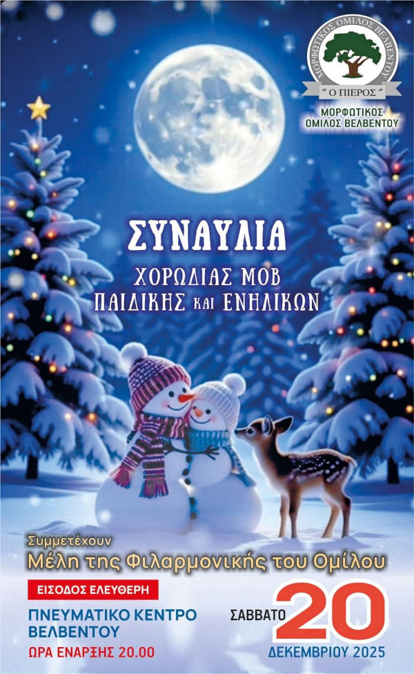 Σέρβια - Βελβεντό 18/12/2025 Χριστουγεννιάτικη Συναυλία της παιδικής χορωδίας και χορωδίας ενηλίκων του Μορφωτικού Ομίλου Βελβεντού 0 Με το δέντρο πλέον αναμμένο, έρχεται και η στιγμή που η Παιδική Χορωδία και η Χορωδία Ενηλίκων του Μορφωτικού Ομίλου Βελβεντού, θα μας ζεστάνουν με μελωδίες Χριστουγεννιάτικες. Ραντεβού το Σάββατο στις 8:00 το βράδυ, στο Πνευματικό κέντρο Βελβεντού.