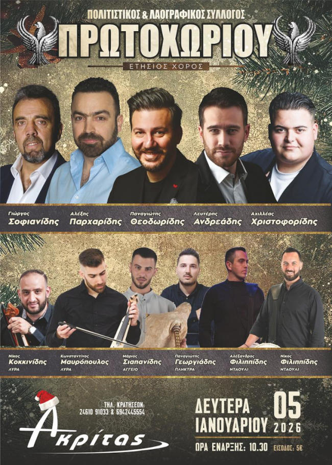 Ο Πολιτιστικός και Λαογραφικός Σύλλογος Πρωτοχωρίου έχει την τιμή να σας προσκαλέσει στον καθιερωμένο χειμερινό χορό του, που θα πραγματοποιηθεί την Δευτέρα 5 Ιανουαρίου 2026, στην αίθουσα δεξιώσεων “Ακρίτας”, στα Αλωνάκια Κοζάνης.