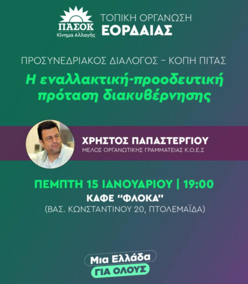 Η Τοπική Οργάνωση ΠΑΣΟΚ – Κινήματος Αλλαγής Εορδαίας καλεί τα μέλη, τους φίλους και κάθε πολίτη που ενδιαφέρεται για τον προοδευτικό διάλογο να δώσουν το παρών, συμβάλλοντας ενεργά στη διαμόρφωση μιας Ελλάδας για όλους.