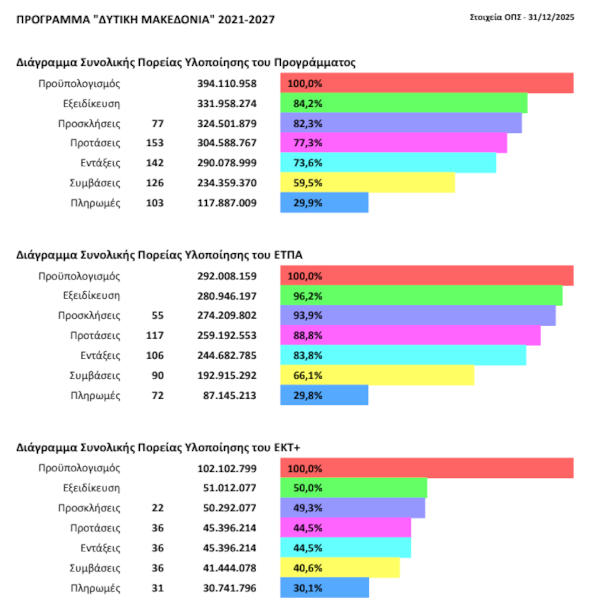 Το Πρόγραμμα «Δυτική Μακεδονία» διαθέτει συνολικό προϋπολογισμό 394,1 εκατ. ευρώ και στοχεύει στην ενίσχυση της έρευνας, της καινοτομίας και της σύνδεσής τους με την τοπική οικονομία. Σύμφωνα με τα στοιχεία που παρουσιάστηκαν, η πορεία υλοποίησης κρίνεται ιδιαίτερα θετική, καθώς: