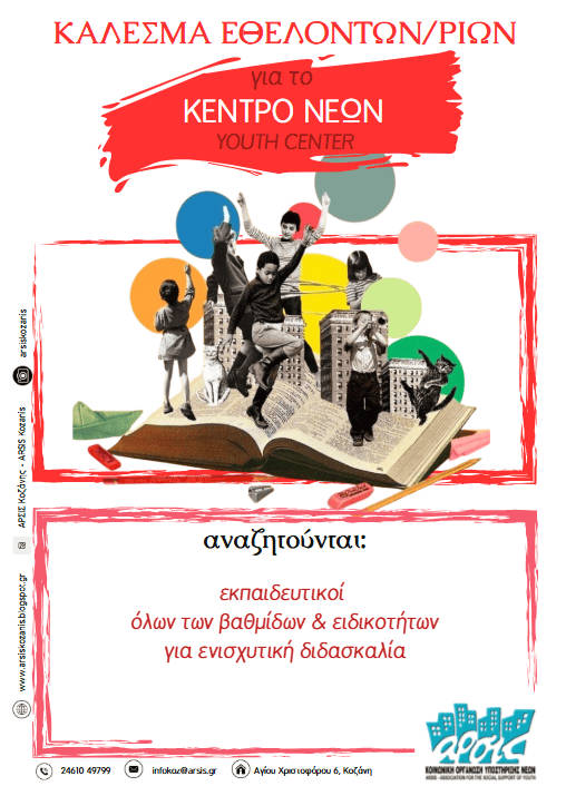 Το Κέντρο Νέων της ΑΡΣΙΣ Κοζάνης ετοιμάζεται να συστηθεί στην πόλη μας και ανοίγει τις πόρτες του αναζητώντας ανθρώπους που θέλουν να μοιραστούν τη γνώση, τη φαντασία και το μεράκι τους με τα παιδιά της πόλης. Αν είσαι εκπαιδευτικός, δάσκαλος/α, φιλόλογος ή έχεις εμπειρία στην ενισχυτική διδασκαλία, μπορείς να επικοινωνήσεις μαζί μας και να γίνεις μέρος της ομάδας του Κέντρου Νέων.