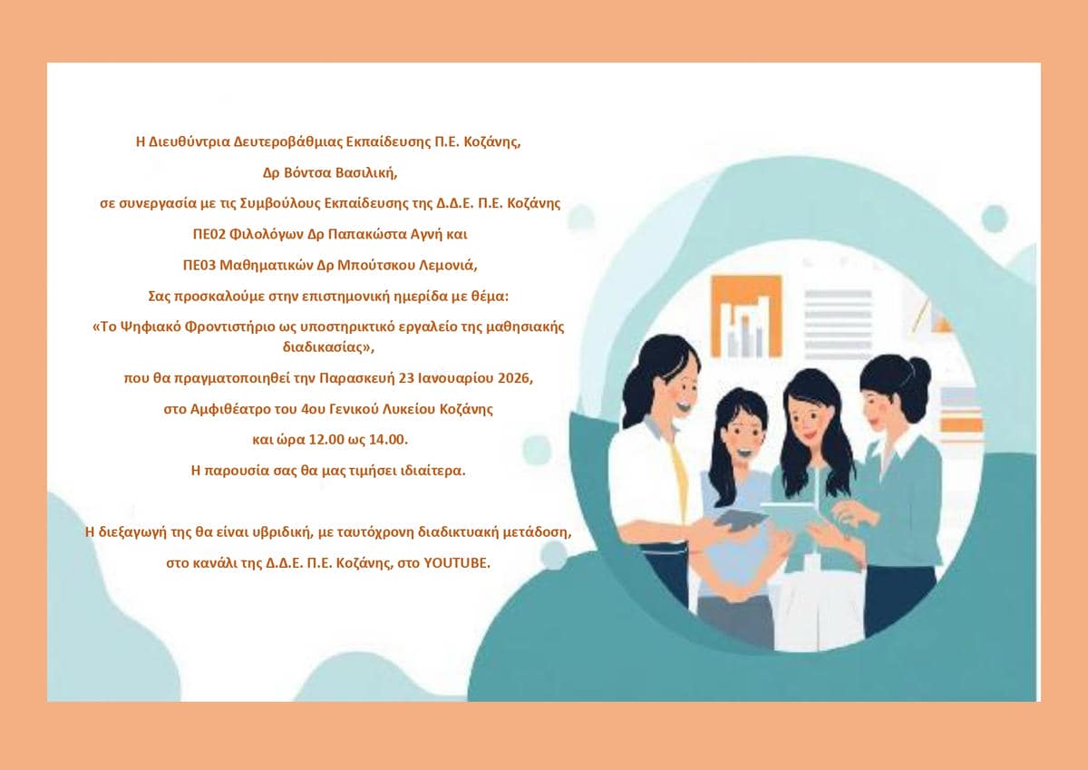 Η Διεύθυνση Δευτεροβάθμιας Εκπαίδευσης Κοζάνης διοργανώνει ημερίδα με θέμα «Το Ψηφιακό Φροντιστήριο ως υποστηρικτικό εργαλείο της μαθησιακής διαδικασίας», την Παρασκευή 23 Ιανουαρίου, στο Αμφιθέατρο του 4ου Γενικού Λυκείου Κοζάνης και ώρα 12.00 με 14.00.