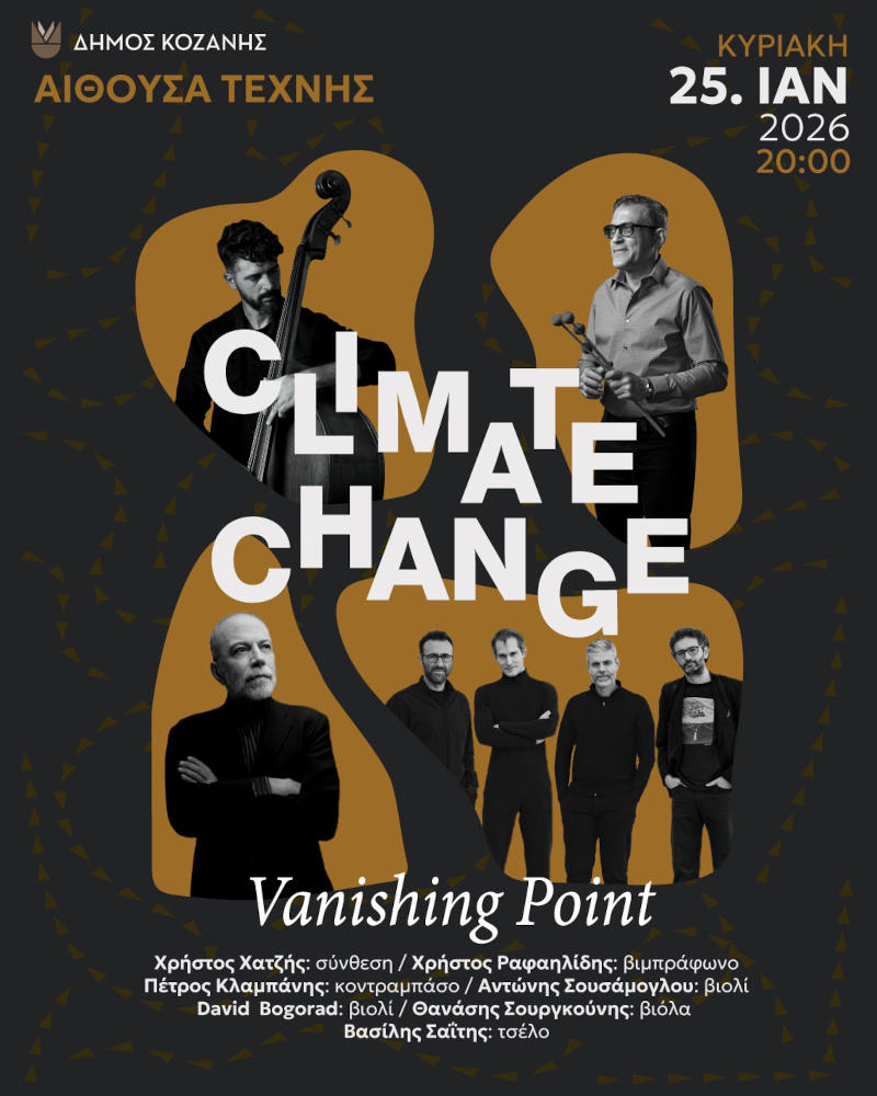 Η Κοζάνη φιλοξενεί μία ξεχωριστή μουσική εκδήλωση υψηλής καλλιτεχνικής αξίας την Κυριακή 25 Ιανουαρίου 2026, στις 20:00, στην Αίθουσα Τέχνης. Το μουσικό σύνολο Climate Change παρουσιάζει το νέο του άλμπουμ Vanishing Point, σε μια συναυλία με ελεύθερη είσοδο για το κοινό, στο πλαίσιο των πολιτιστικών δράσεων του Δήμου Κοζάνης.