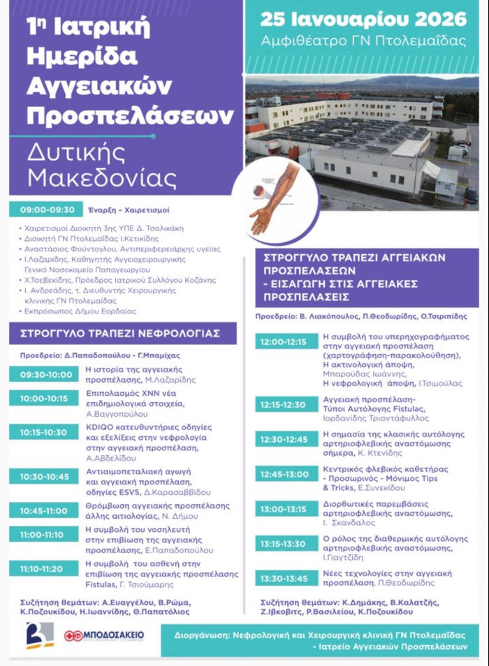 Η Νεφρολογική και η Χειρουργική Κλινική του Γενικού Νοσοκομείου Πτολεμαΐδας «Μποδοσάκειο», σε συνεργασία με το Ιατρείο Αγγειακών Προσπελάσεων, διοργανώνουν την 1η Ιατρική Ημερίδα Αγγειακών Προσπελάσεων Δυτικής Μακεδονίας.