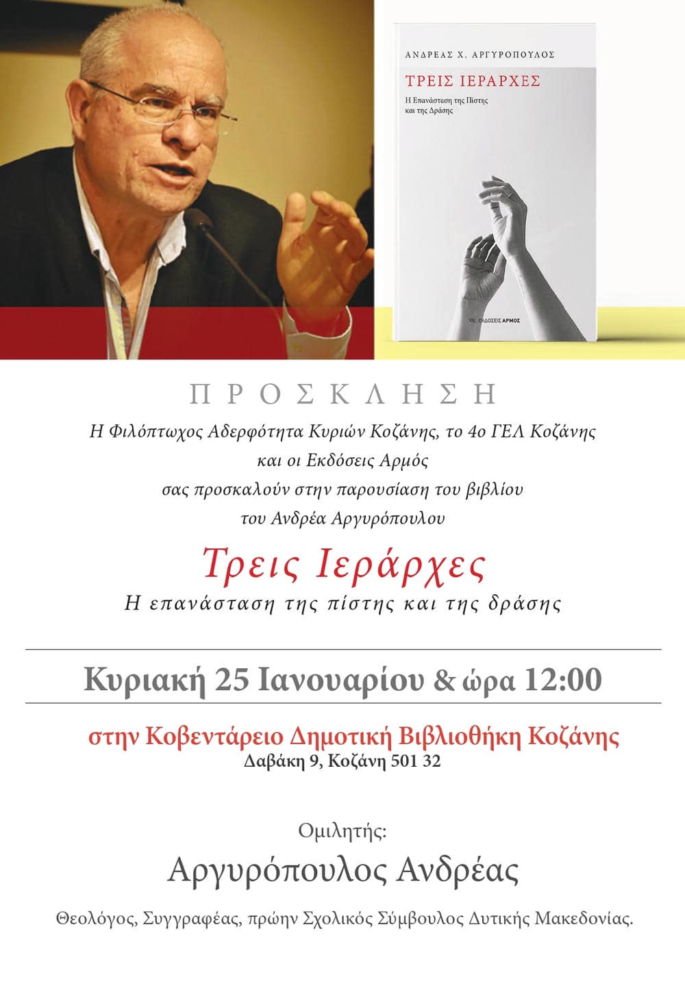 Η “Φιλόπτωχος Αδερφότητα Κυριών Κοζάνης”, το 4ο ΓΕΛ Κοζάνης και οι Εκδόσεις “Αρμός” σας προσκαλούν στην παρουσίαση του νέου βιβλίου του Ανδρέα Αργυρόπουλου “Τρεις Ιεράρχες. Η επανάσταση της πίστης και της δράσης.”