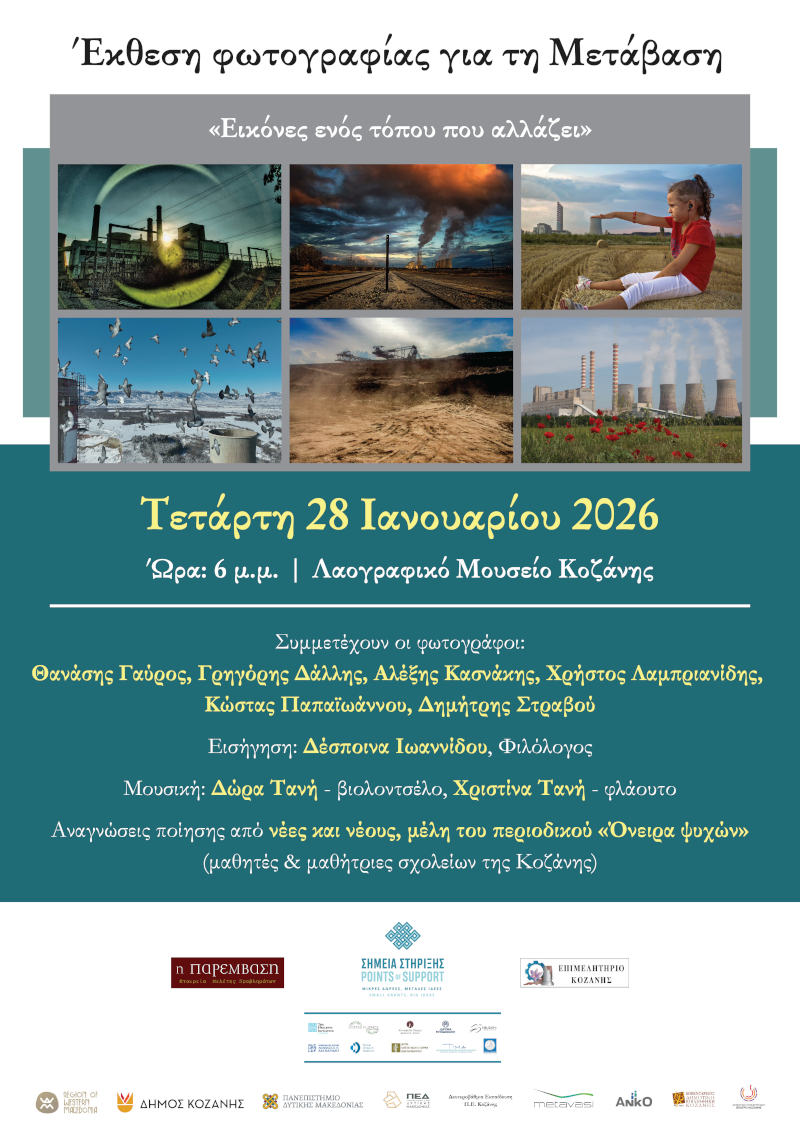 Μια ξεχωριστή φωτογραφική έκθεση αφιερωμένη στη Μετάβαση και στη μεταλιγνιτική ταυτότητα της Δυτικής Μακεδονίας θα φιλοξενηθεί την Τετάρτη 28 Ιανουαρίου 2026, στις 18:00, στο Λαογραφικό Μουσείο Κοζάνης, με τίτλο «Εικόνες ενός τόπου που αλλάζει».