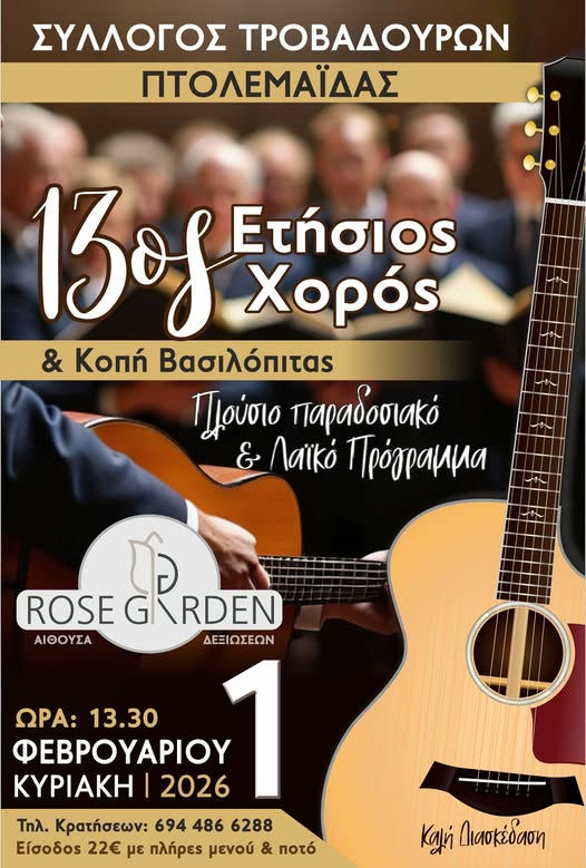 Στο καθιερωμένο ετήσιο ραντεβού του επιστρέφει ο Σύλλογος Τροβαδούρων Πτολεμαΐδας, ανακοινώνοντας τη διεξαγωγή του ετήσιου χορού του, που θα συνδυαστεί και φέτος με την κοπή της βασιλόπιτας για το 2026.