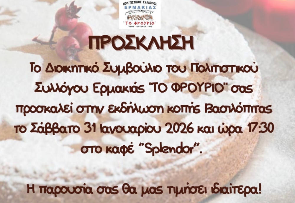 Το Διοικητικό Συμβούλιο του Πολιτιστικού Συλλόγου Ερμακιάς “ΤΟ ΦΡΟΥΡΙΟ” σας προσκαλεί στην εκδήλωση κοπής Βασιλόπιτας το Σάββατο 31 Ιανουαρίου 2026 και ώρα 17:30 στο καφέ “Splendor”.