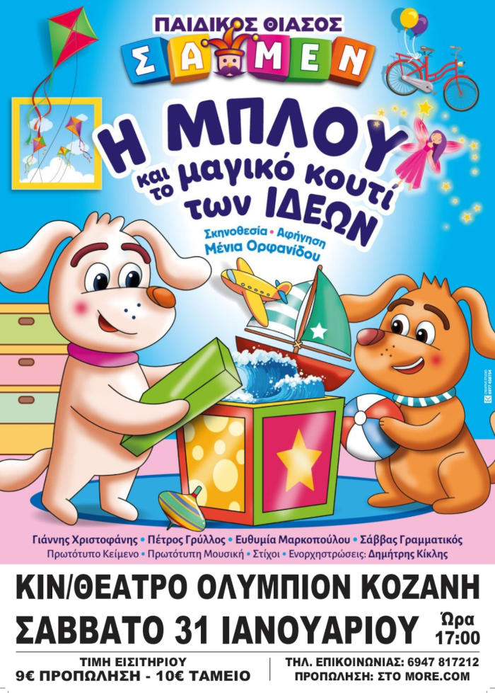 Μετά από δύο συνεχόμενες sold out σεζόν, η καταξιωμένη παιδική σκηνή ΣΑΜΕΝ παρουσιάζει το νέο θεατρικό έργο του Δημήτρη Κίκλη, «Η Μπλου και το μαγικό κουτί των ιδεών». Πρόκειται για μια τρυφερή και άκρως διαδραστική περιπέτεια, σχεδιασμένη να μαγέψει θεατές από 2 έως… 102 ετών.