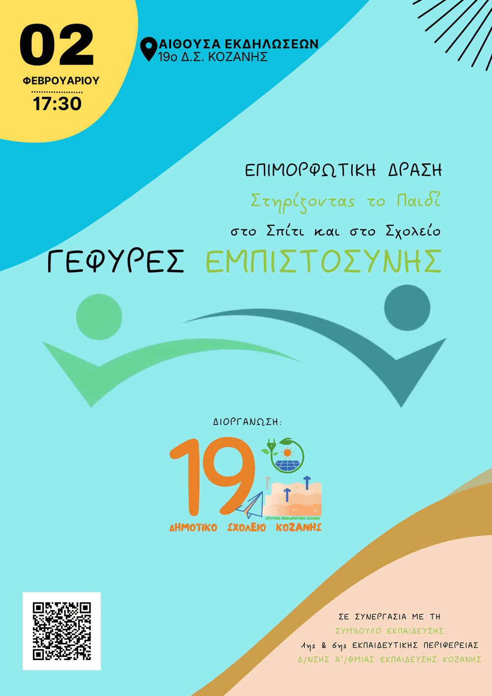 Ο Διευθυντής Χρήστος Κουτρώτσιος και ο Σύλλογος Διδασκόντων του 19ου Δημοτικού Σχολείου Κοζάνης ,σε συνεργασία με τη Σύμβουλο Παιδαγωγικής Ευθύνης Μαρίνα Χαρισοπούλου, σας προσκαλούν σε επιμορφωτική δράση με θέμα : Γέφυρες Εμπιστοσύνης, Στηρίζοντας το Παιδί στο Σπίτι και στο Σχολείο.
