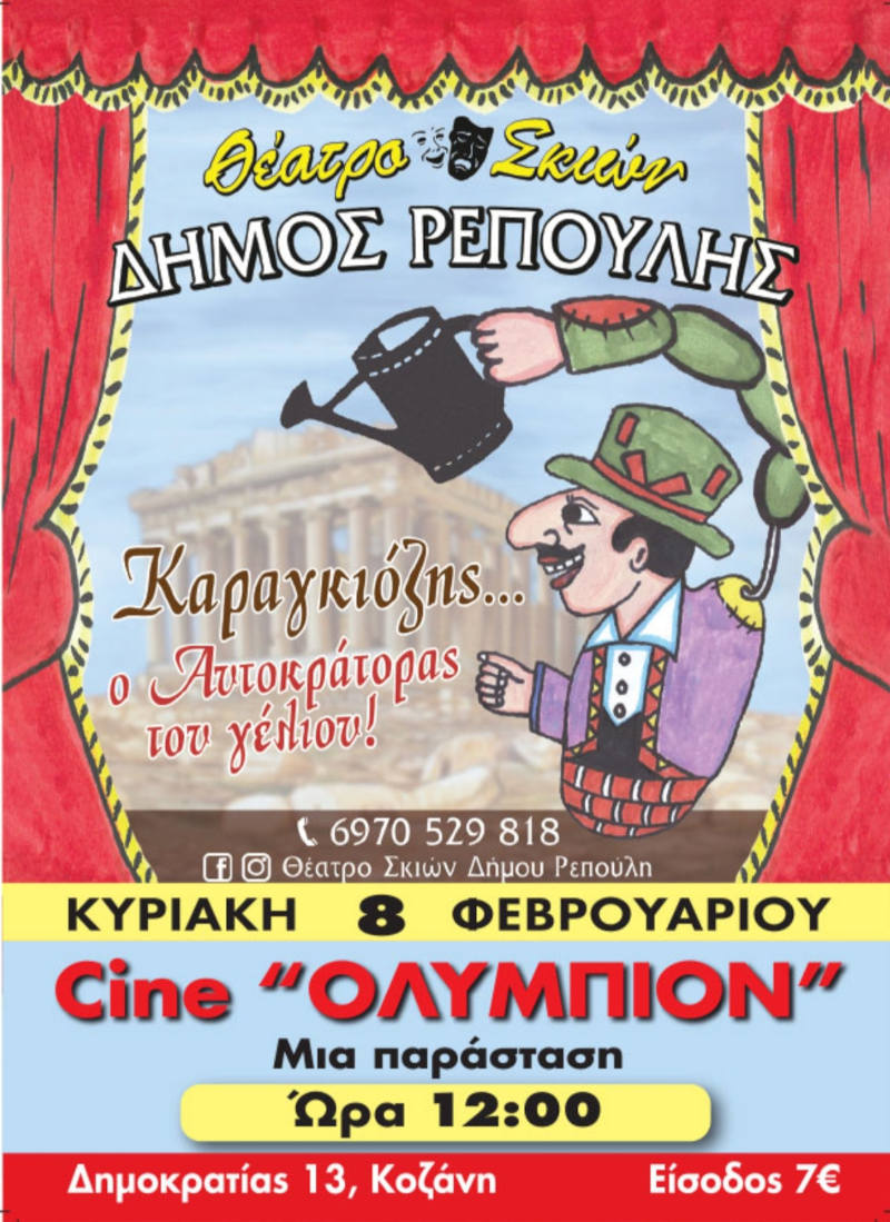 Το Θέατρο Σκιών του Δήμου Ρεπούλη, έρχεται, ΓΙΑ ΠΡΩΤΗ ΦΟΡΑ, για να σας παρουσιάσει, μια ξεκαρδιστική κωμωδία, από τα (ουκ ολίγα) κατορθώματα του γνωστού σε όλους μας Καραγκιόζη!