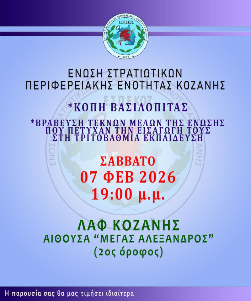 Με επίκεντρο τη νέα γενιά και την αξία της εκπαίδευσης, η Ένωση Στρατιωτικών Περιφερειακής Ενότητας Κοζάνης διοργανώνει το Σάββατο 7 Φεβρουαρίου 2026 την καθιερωμένη κοπή της βασιλόπιτας, σε συνδυασμό με την ετήσια τελετή βράβευσης των μαθητών – τέκνων των μελών της, που πέτυχαν την εισαγωγή τους στην τριτοβάθμια εκπαίδευση κατά το έτος 2025.