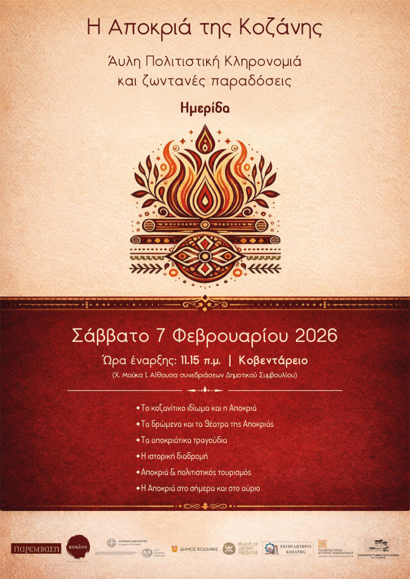 Ημερίδα με θέμα «Η Αποκριά της Κοζάνης: Άυλη πολιτιστική κληρονομιά και ζωντανές παραδόσεις» θα πραγματοποιηθεί το Σάββατο 7 Φεβρουαρίου 2026, στο Κοβεντάρειο (Αίθουσα Συνεδριάσεων Δημοτικού Συμβουλίου, Χ. Μούκα 1-7 ). Ώρα έναρξης: 11.15 π.μ.
