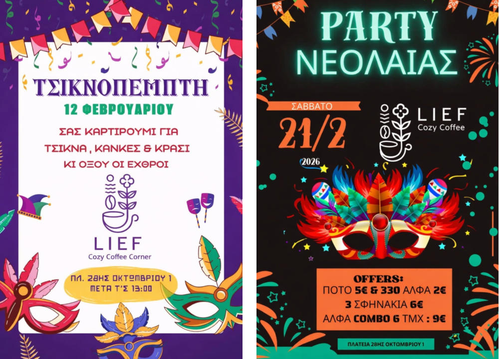 Το γωνιακό ,cozy καφέ , ‘LIEF COFFEE’ στο κέντρο της Κοζάνης, στην οδό 28ης Οκτωβρίου 1 & Ξεν. Τριανταφυλλίδη Γωνία έχει ετοιμάσει δύο αξέχαστα event για την φετινή Αποκριά.