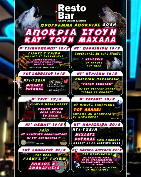 Resto Bar – ΑΠΟΚΡΙΑ ΣΤΟΥΝ ΚΑΤ’ ΤΟΥΝ ΜΑΧΑΛΑ