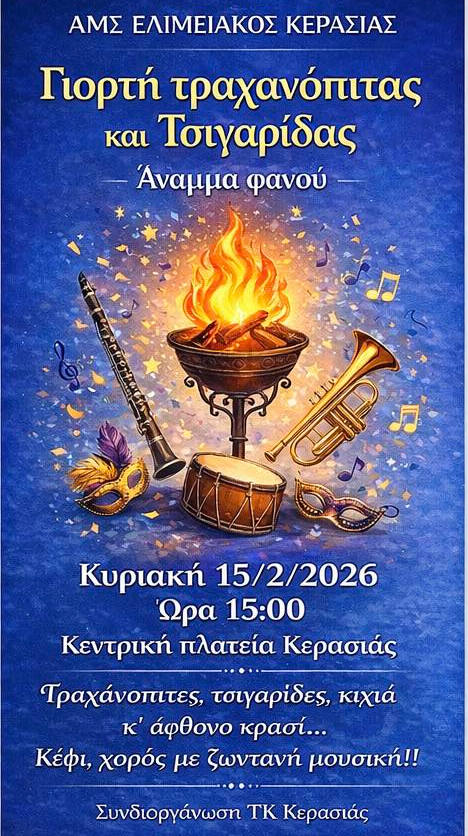 Ο ΑΜΣ Ελιμειακός Κερασιάς σας προσκαλεί στη Γιορτή τραχανόπιτας – τσιγαρίδας που διοργανώνει την Κυριακή 15/02/2026 και ώρα 15:00 στην κεντρική πλατεία του χωριού.