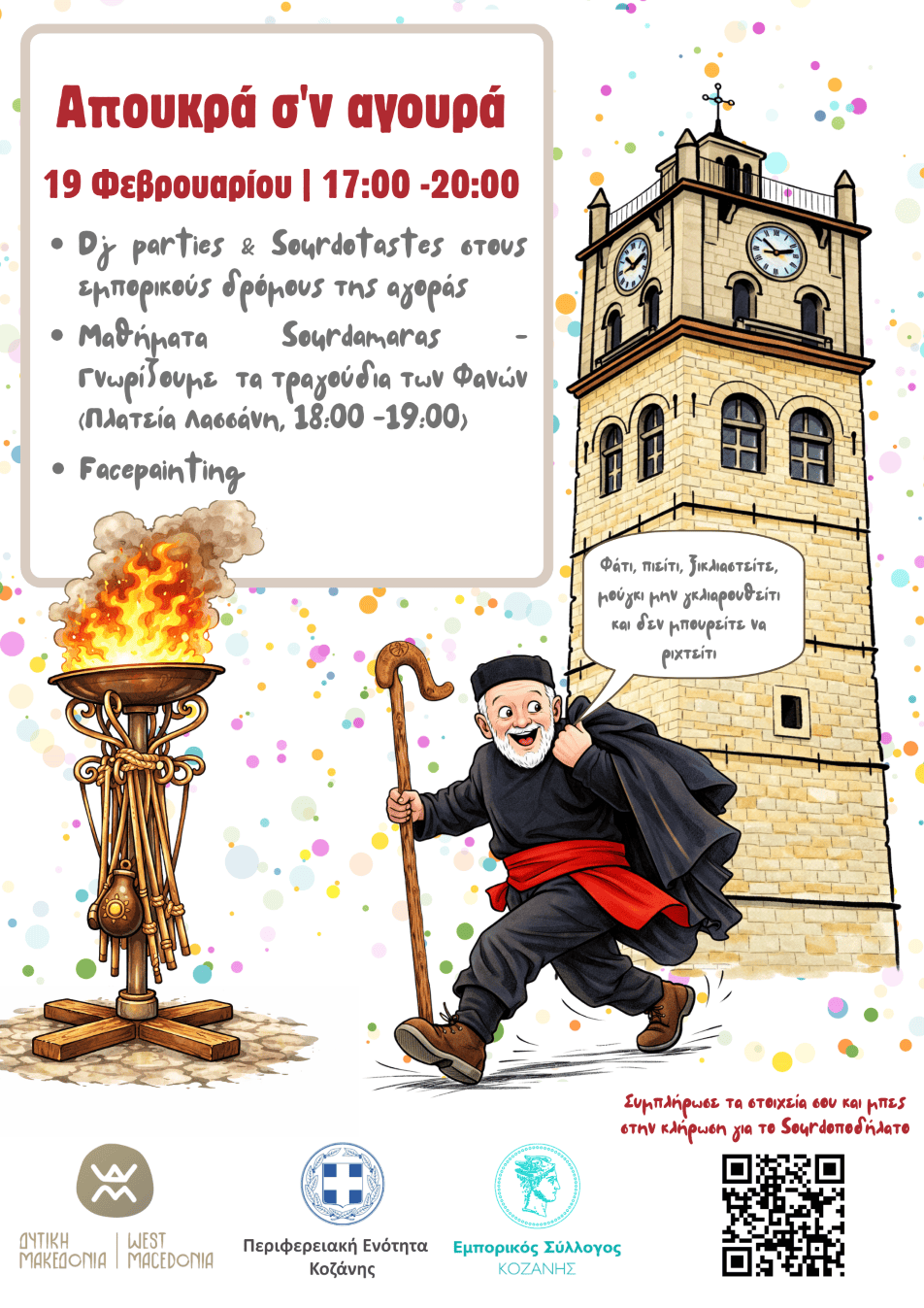 Στην Πλατεία Λασσάνη, από τις 18:00 έως τις 19:00…μαθήματα Sourdamaras, μέσα από τα οποία μικροί και μεγάλοι θα έχουν την ευκαιρία να γνωρίσουν και να τραγουδήσουν τα παραδοσιακά αποκριάτικα τραγούδια των Φανών, συμμετέχοντας ενεργά στο αυθεντικό πνεύμα της Κοζανίτικης Αποκριάς.