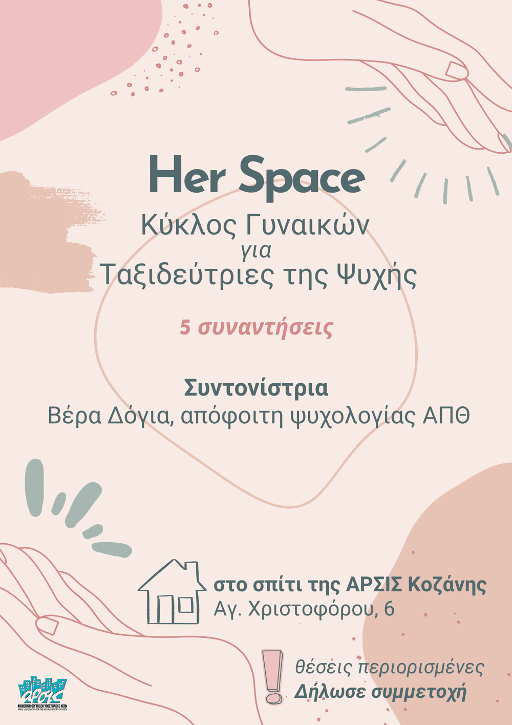 Η ΑΡΣΙΣ Κοζάνης και η Βέρα Δόγια (απόφοιτη ψυχολογίας ΑΠΘ) σε προσκαλούμε σε έναν κύκλο γυναικών για Ταξιδεύτριες της Ψυχής με όνομα “Her Space” που θα αποτελεί έναν φιλόξενο και ασφαλή χώρο με σκοπό να συναντηθούμε, να μοιραστούμε, να εκφραστούμε δημιουργικά και να συνδεθούμε- με τον εαυτό μας αλλά και μεταξύ μας.