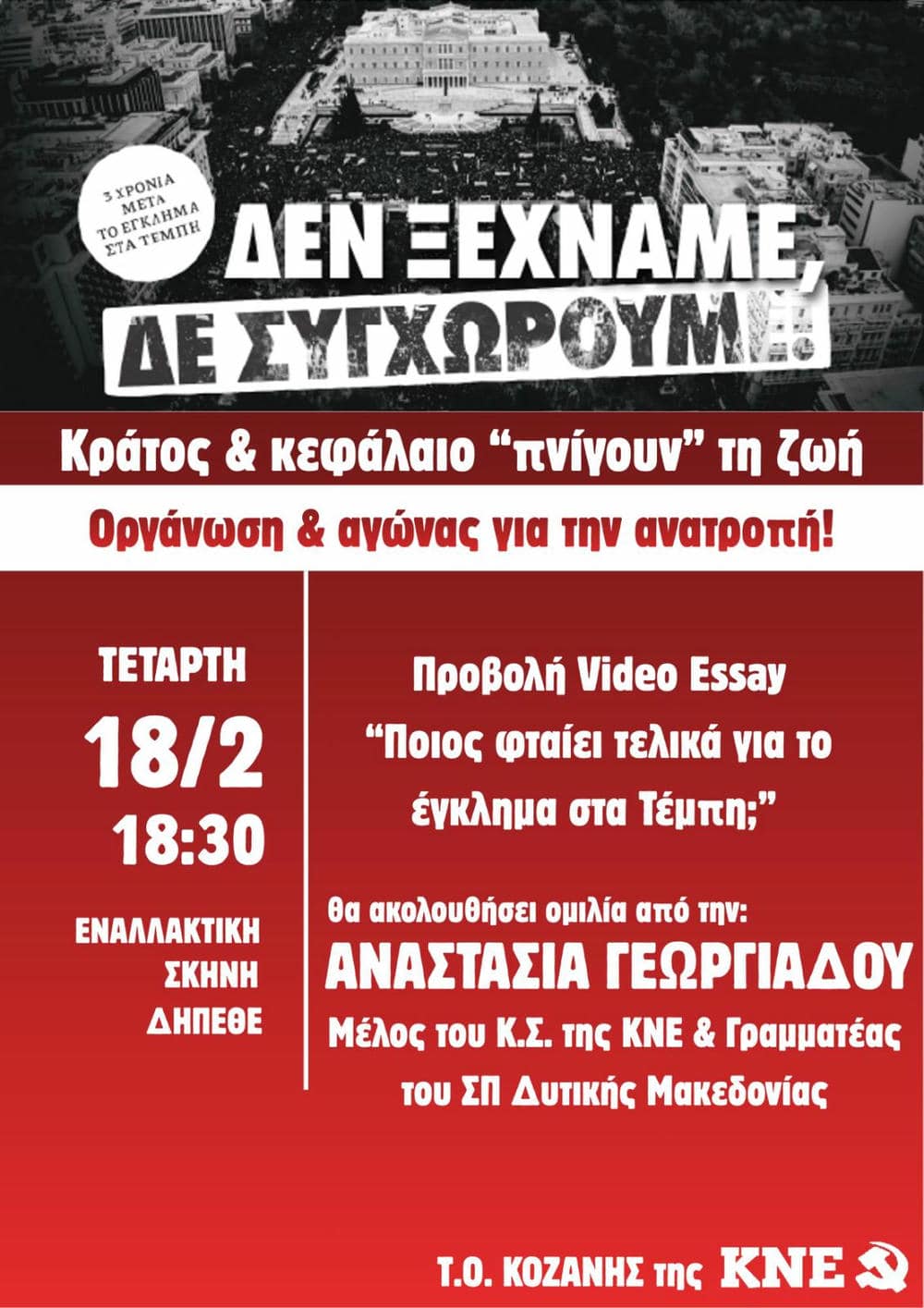 Την Τετάρτη 18/2, θα πραγματοποιηθεί εκδήλωση της Τομεακής Οργάνωσης Κοζάνης της ΚΝΕ, στην Εναλλακτική Σκηνή του ΔΗΠΕΘΕ, στις 18.30 με τίτλο: “Τρία χρόνια από το έγκλημα στα Τέμπη. Κράτος και Κεφάλαιο πνίγουν τη ζωή. Οργάνωση και αγώνας για την Ανατροπή”. Στην εκδήλωση, θα προβληθεί το Video Essay της ΚΝΕ με τίτλο: “Ποιος φταίει τελικά για τα Τέμπη;”. Θα πραγματοποιηθεί ομιλία από την Αναστασία Γεωργιάδου, μέλος τους ΚΣ της ΚΝΕ και Γραμματεά της Οργάνωσης Περιοχής Δυτικής Μακεδονίας της ΚΝΕ.