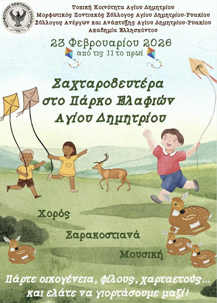 H Τοπική Κοινότητα Αγίου Δημητρίου, ο Μορφωτικός Ποντιακός Σύλλογος Αγίου Δημητρίου – Ρυακίου, ο Σύλλογος Ανέργων Αγίου Δημητρίου – Ρυακίου και ο Ελλησπόντιος Αθλητικός Όμιλος σας προσκαλούν να γιορτάσουμε μαζί την Καθαρά Δευτέρα.