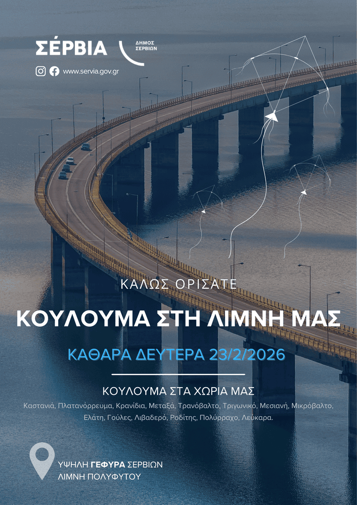 Ο Δήμος Σερβίων προσκαλεί δημότες και επισκέπτες τη Δευτέρα 23 Φεβρουαρίου 2026 να συμμετάσχουν στις εκδηλώσεις για τα Κούλουμα, σε μια ημέρα αφιερωμένη στην παράδοση, στις γεύσεις και στη ζωντανή μουσική.