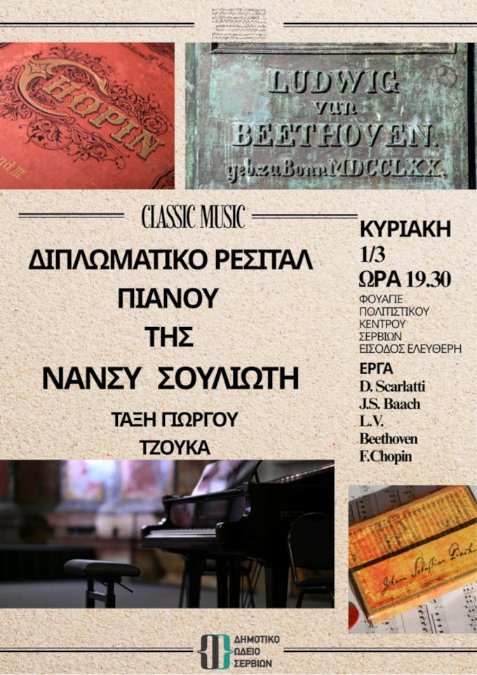 Μια ιδιαίτερη μουσική συνάντηση ετοιμάζει το Δημοτικό Ωδείο Σερβίων, καθώς η Νάνσυ Σουλιώτη παρουσιάζει το Διπλωματικό της Ρεσιτάλ Πιάνου, την Κυριακή 1η Μαρτίου.