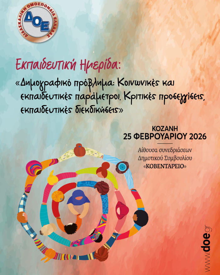 Το Δ.Σ. της Δ.Ο.Ε. σε συνεργασία με τον Σύλλογο Εκπαιδευτικών Π.Ε. Κοζάνης, διοργανώνουν επιστημονική ημερίδα με θέμα: «Δημογραφικό πρόβλημα: Κοινωνικές και εκπαιδευτικές παράμετροι. Κριτικές προσεγγίσεις, εκπαιδευτικές διεκδικήσεις», την Τετάρτη 25 Φεβρουαρίου 2026, ώρα 9.00–15.00 στην αίθουσα συνεδριάσεων Δημοτικού Συμβουλίου Κοζάνης Κοβεντάρειο.