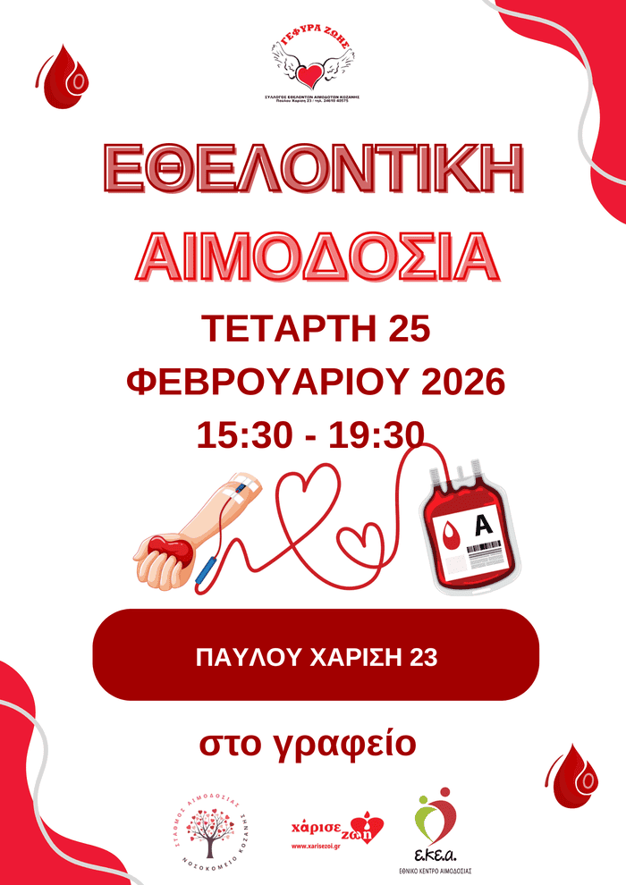 Την Τετάρτη 25 Φεβρουαρίου 2026, από 15:30 έως 19:30, σας προσκαλούμε να συμμετάσχετε στην εθελοντική αιμοδοσία που θα πραγματοποιηθεί στα γραφεία του Συλλόγου μας, Παύλου Χαρίση 23.Οι ανάγκες για αίμα στο Τμήμα Αιμοδοσίας του Μαμάτσειου Νοσοκομείου Κοζάνης είναι αυξημένες και η δική σας προσφορά μπορεί να γίνει η ελπίδα για έναν συνάνθρωπό μας.