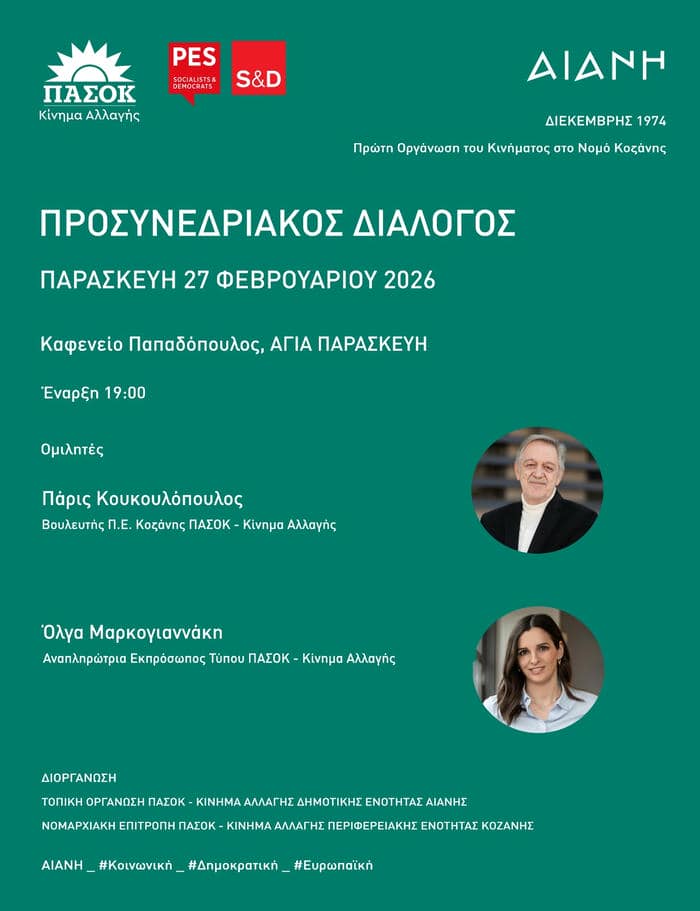 Η Τοπική Οργάνωση ΠΑΣΟΚ – Κινήματος Αλλαγής Δημοτικής Ενότητας Αιανής, σε συνεργασία με τη Νομαρχιακή Επιτροπή Π.Ε. Κοζάνης, προσκαλεί τα μέλη, τους φίλους του κινήματος και τους πολίτες της περιοχής σε ανοιχτή εκδήλωση Προσυνεδριακού Διαλόγου.