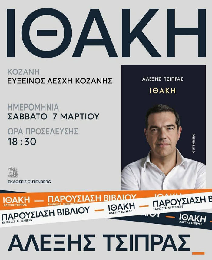Στην πόλη της Κοζάνης θα βρεθεί το Σάββατο 7 Μαρτίου 2026 ο πρώην Πρωθυπουργός, Αλέξης Τσίπρας, για την παρουσίαση του νέου του βιβλίου με τίτλο «Ιθάκη».