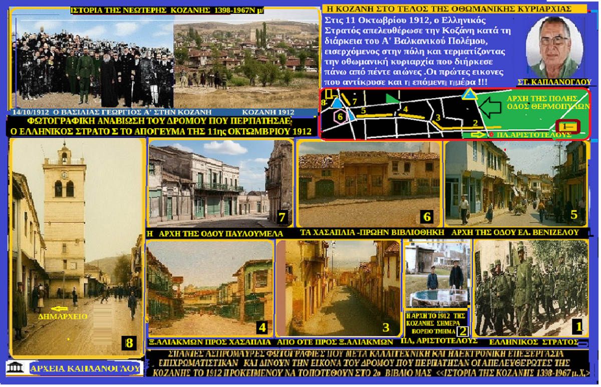 Εκμεταλλευόμενοι την νέα τεχνολογία και έχοντας στα χεριά μας σπάνιες ασπρόμαυρες φωτογραφίες θελήσαμε να αναβιώσαμε φωτογραφικά για πρώτη φορά τον ιστορικό αυτό δρόμο που πρώτος δέχθηκε το προνόμιο να ενταχθεί το ελεύθερο Ελληνικό κράτος στις 4.40 της 11ης Οκτωβρίου στην πόλη της Κοζάνης .