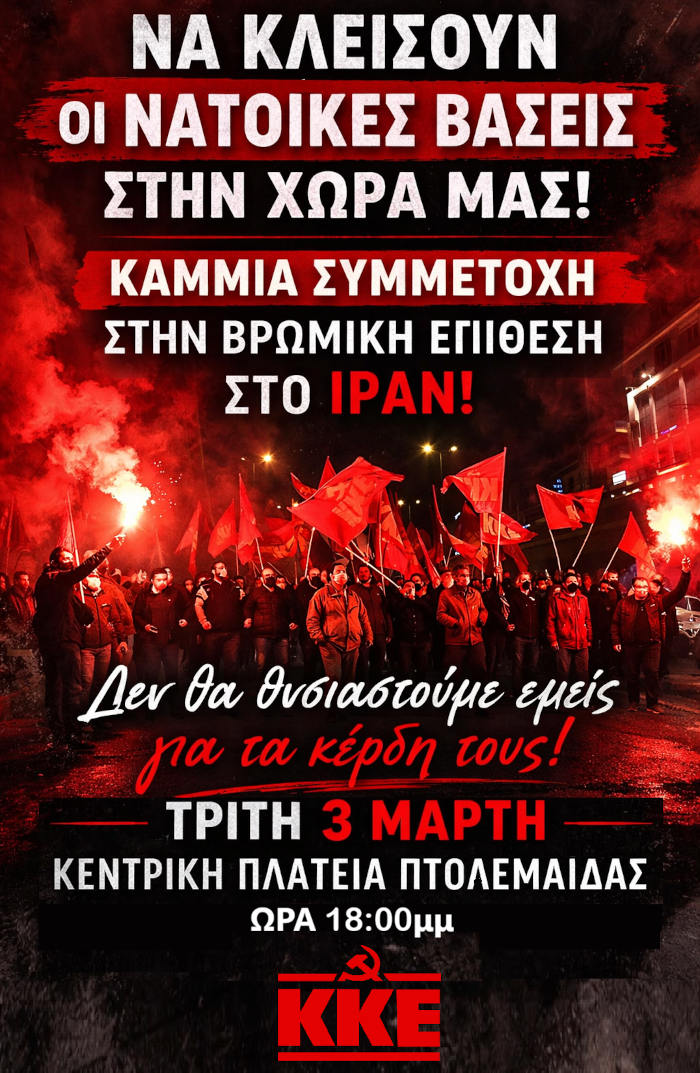 Τώρα χρειάζεται ο λαός μας να δυναμώσει την αλληλεγγύη του στον ιρανικό λαό και όλους τους λαούς που είναι θύματα της ιμπεριαλιστικής βαρβαρότητας, απαιτώντας να κλείσει η βάση της Σούδας και οι άλλες στρατιωτικές βάσεις, να ανακληθεί η ελληνική πυροβολαρχία Πάτριοτ από τη Σαουδική Αραβία και να επιστρέψει η φρεγάτα του Πολεμικού Ναυτικού από την Ερυθρά Θάλασσα.